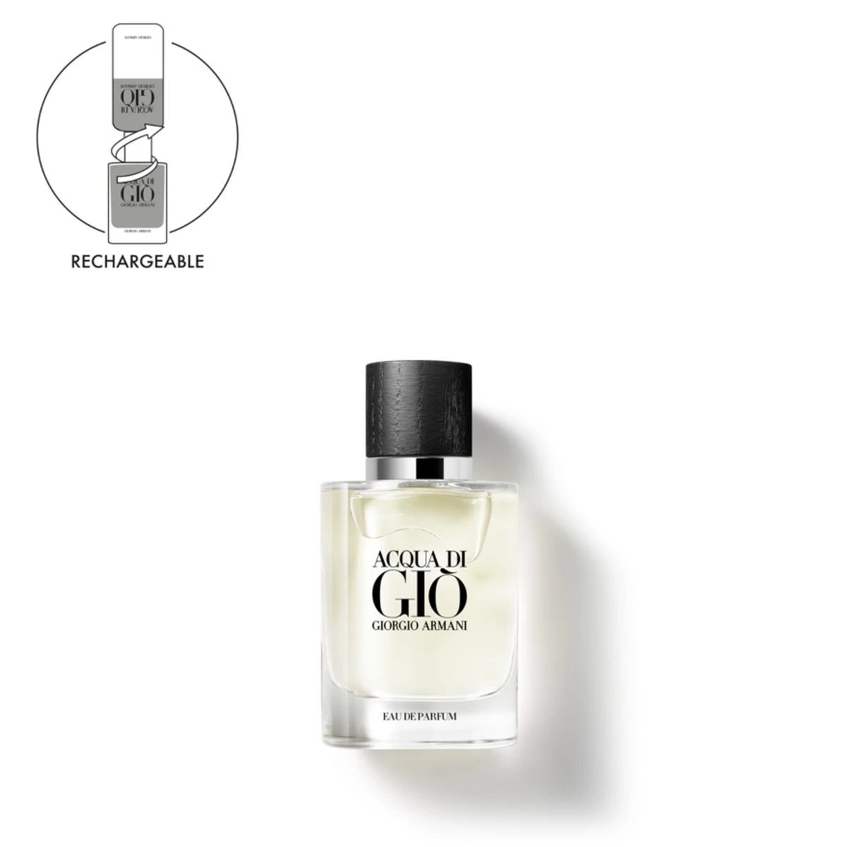 Le flacon emblématique d’Acqua di Giò a également été repensé pour cette nouvelle Eau de Parfum, serti d’un capot en bois sombre et désormais rechargeable sur tous les formats. Un flacon élégant conçu pour durer.