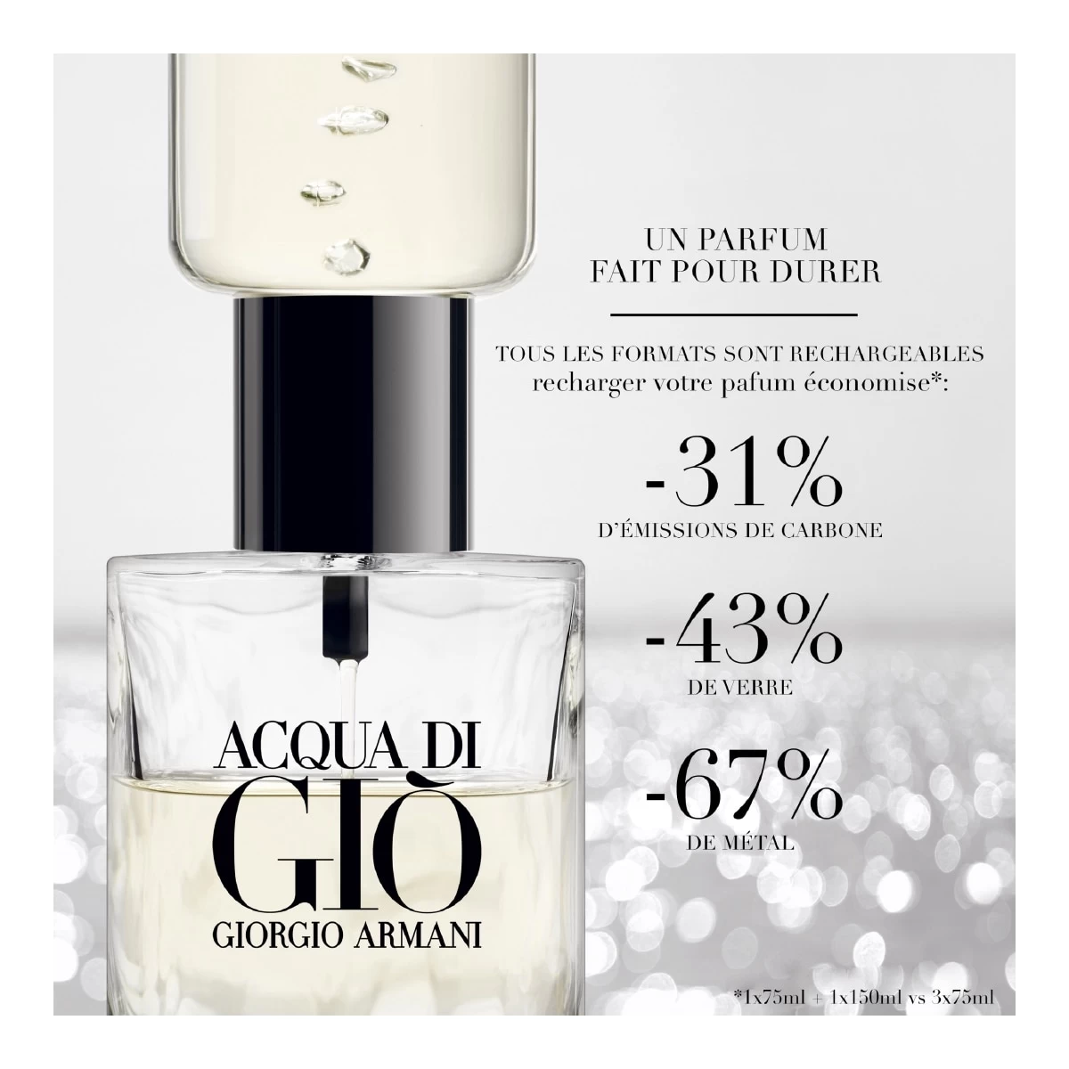 Giorgio Armani s’engage pour un avenir plus durable avec la nouvelle Eau de Parfum d’Acqua di Giò. Un parfum qui intègre des ingrédients issus de filières responsables et soutient des programmes de préservation des forêts. Grâce à son flacon rechargeable, Acqua di Giò réduit son empreinte carbone et son impact sur l’environnement. Acqua di Giò, un parfum pour le futur.