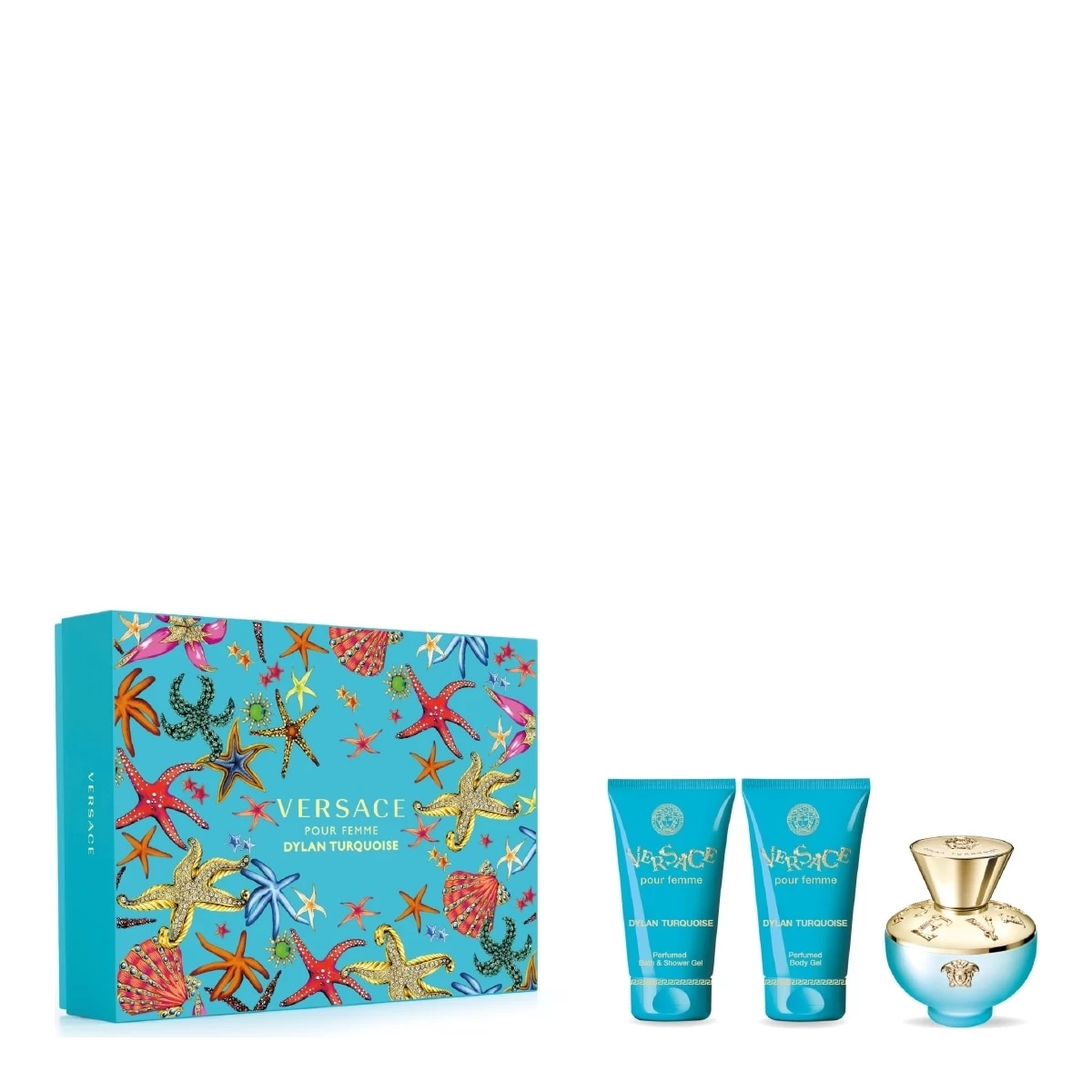 Retrouvez dans ce coffret l’Eau de Toilette VERSACE Dylan Turquoise 50ml, et 2 cadeaux: son gel bain&douche 50ml, et son lait pour le corps 50ml