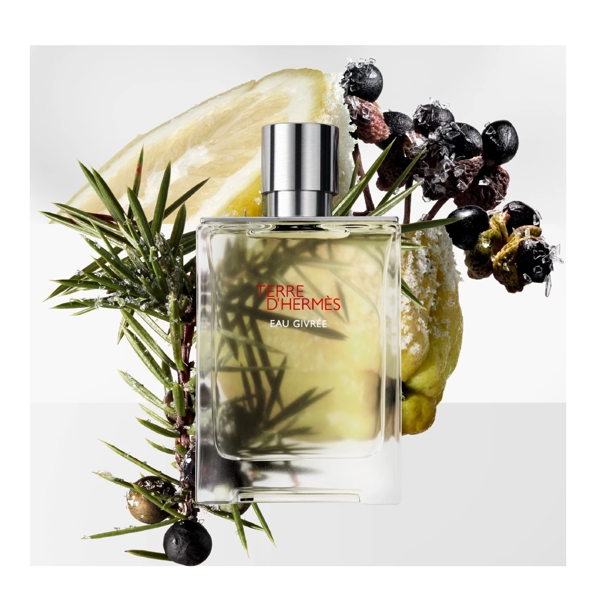 L’Eau de Parfum Terre d’Hermès Eau Givrée allie un cédrat vif, une baie de genièvre à la fraîcheur incisive et un poivre Timut fusant. La sensation saisissante d’un souffle glacé y côtoie la générosité des notes minérales et boisées typiques de Terre d’Hermès.