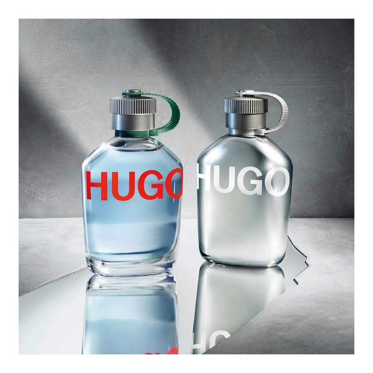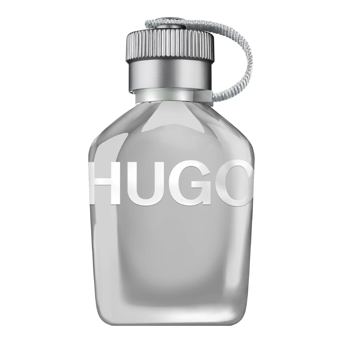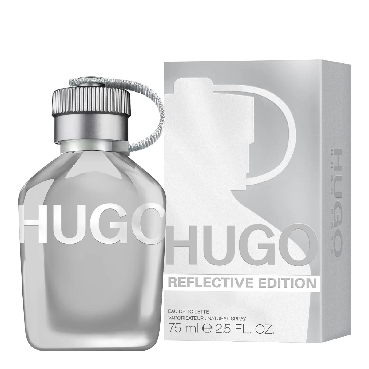 L’Eau de toilette pour Homme HUGO Reflective est présentée dans un flacon métallique à effet miroir, doté d’un logo argenté et d’un bouchon assorti fixé par une bride en tissu réfléchissante.