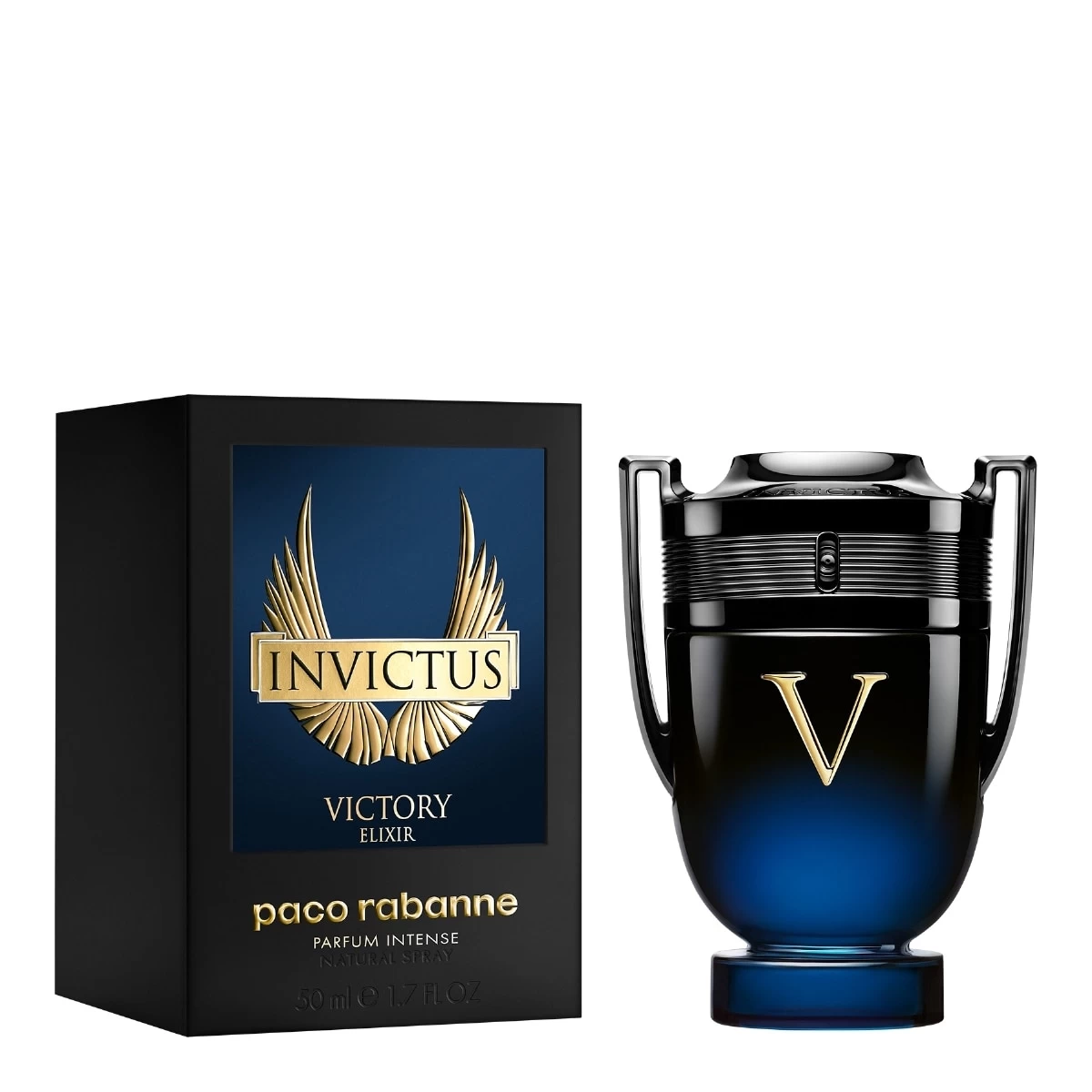 Contenu dans son flacon emblématique en forme de trophée, le parfum Invictus Victory Elixir de Paco Rabanne s’enveloppe d’une laque dégradée de noir et de bleu profond. Surmonté d’un V doré, son capot noir brillant symbolise le triomphe absolu.